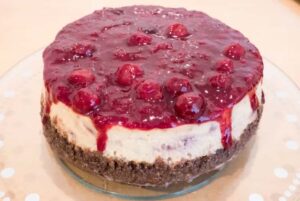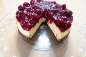 9. Pentru topping se amestecă toate ingredientele până compoziția de îngroașă, se lasă la răcit și apoi se toarnă peste cheesecake-ul, de asemenea răcit și el.